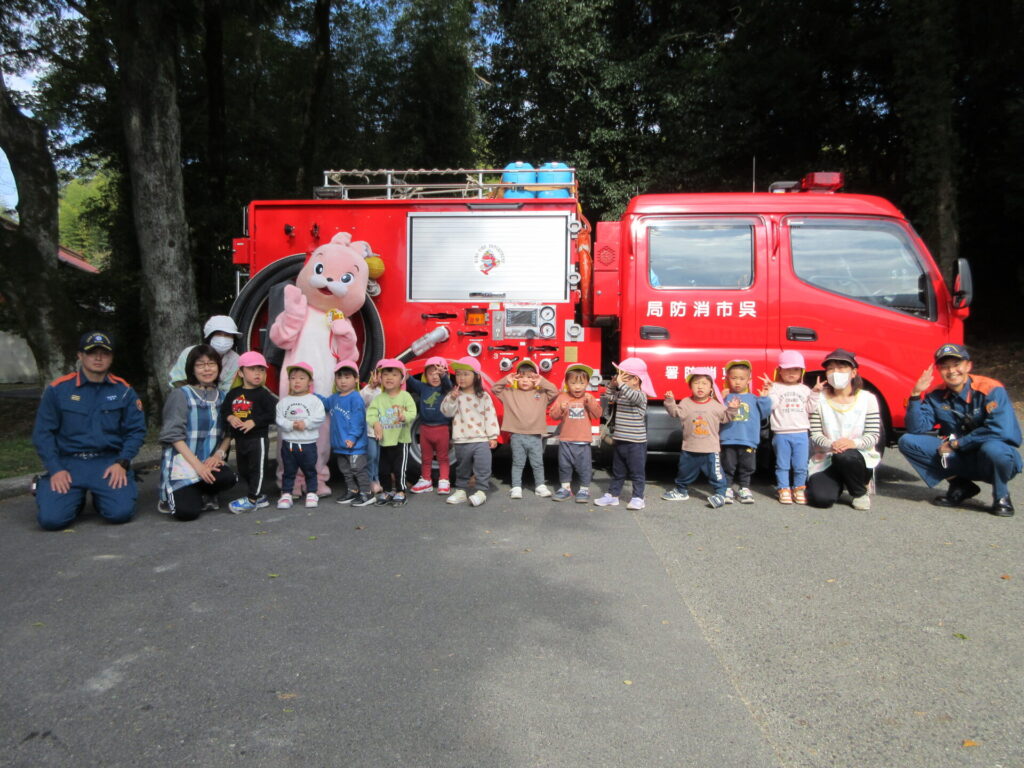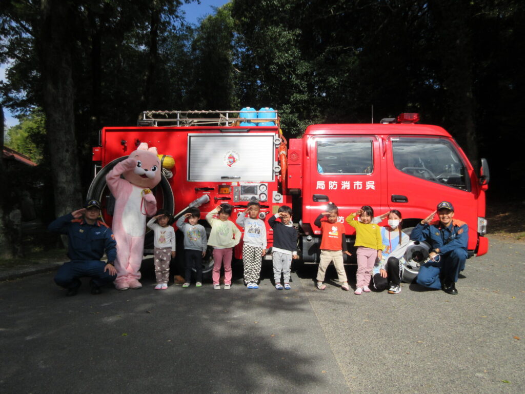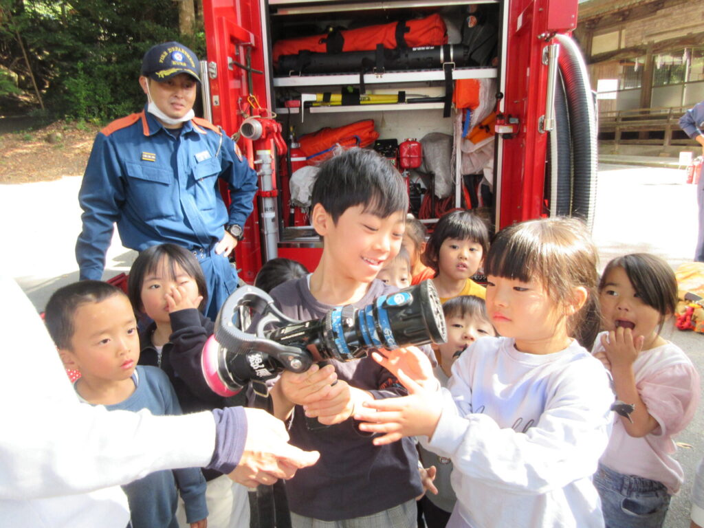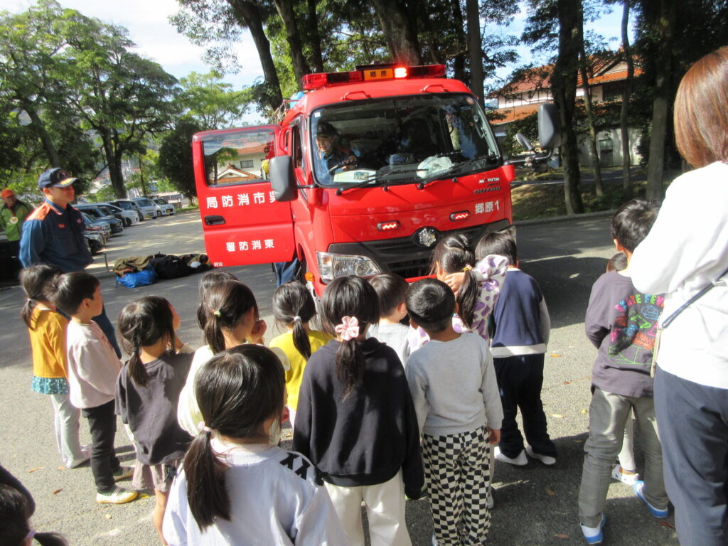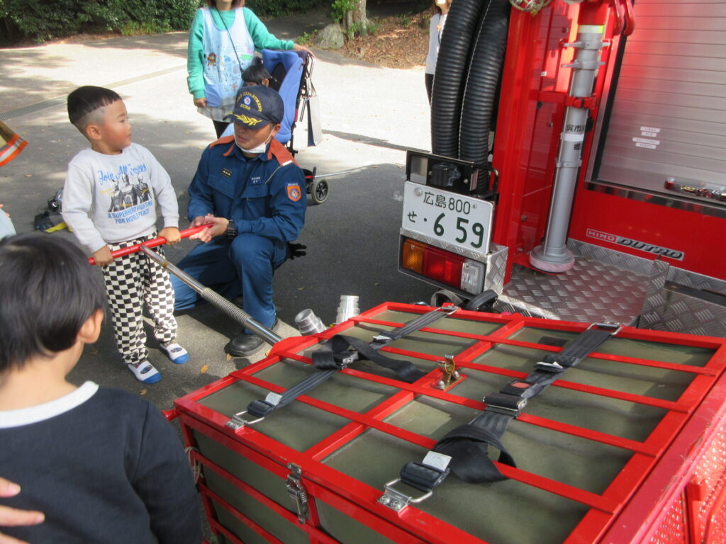 その後は、消防隊員の方が消防車や装備を見せてくださったり、サイレンの音を聞かせてくださったり、実際に消防服を着る様子を見せてくださったり、と盛り沢山で、子どもたちは目を輝かせて見ていました。