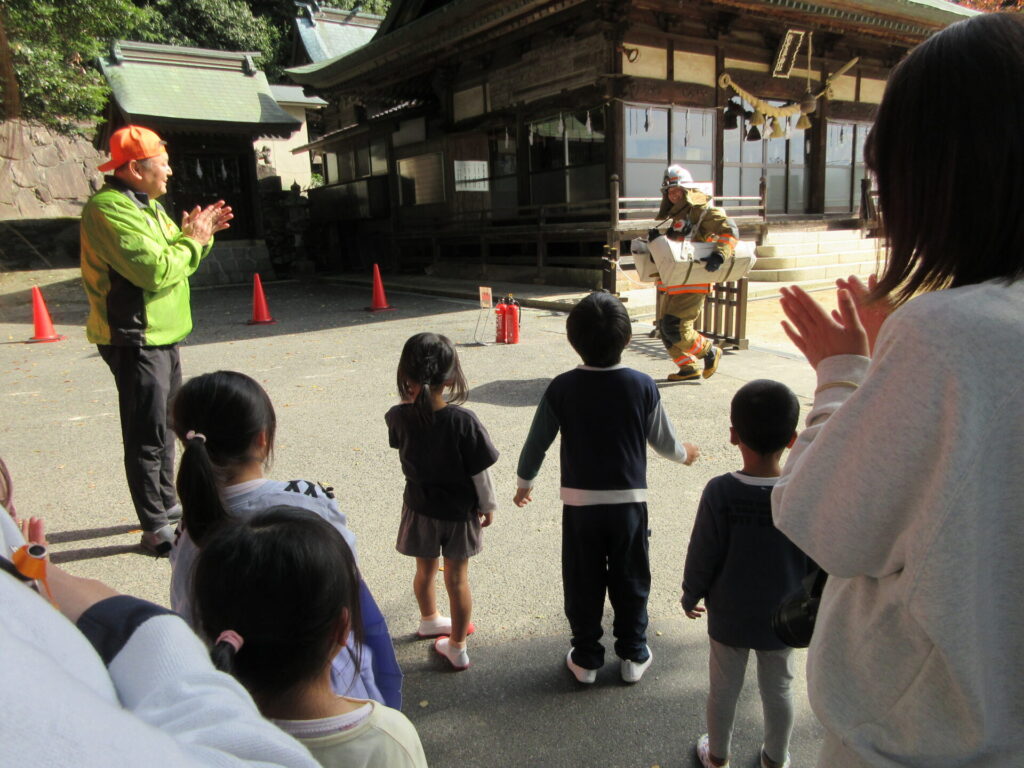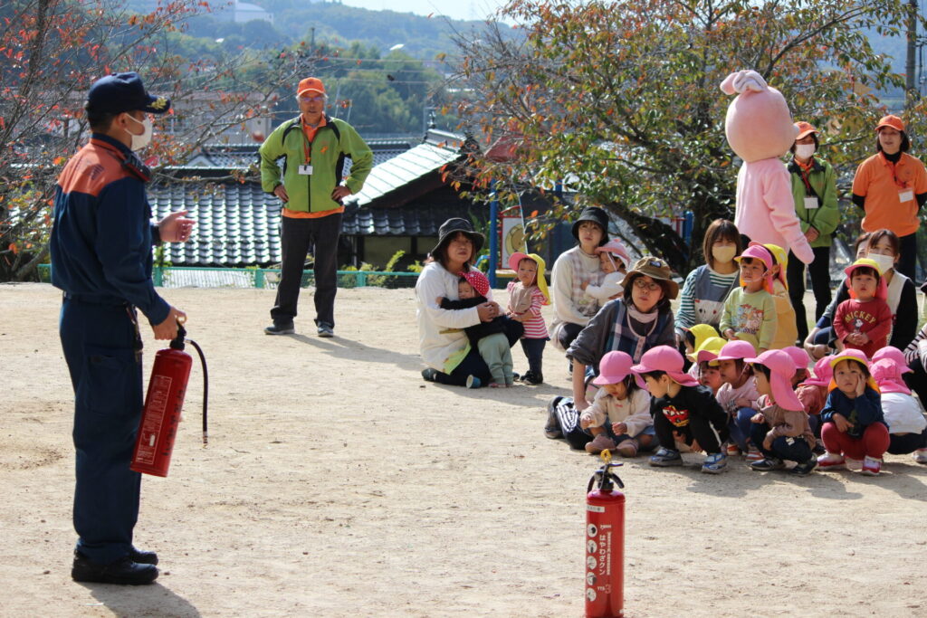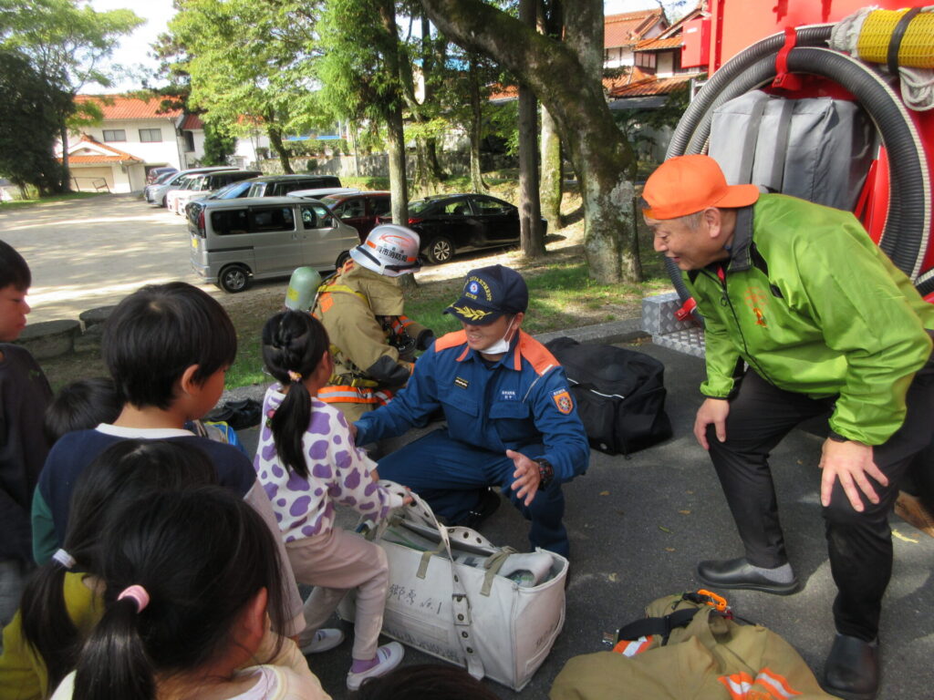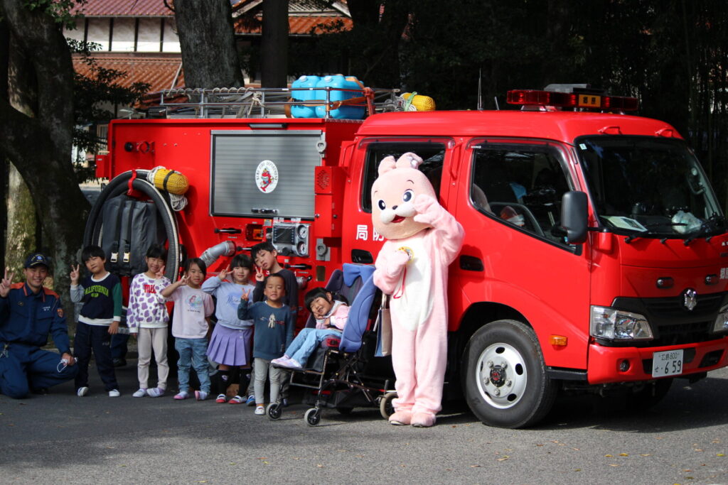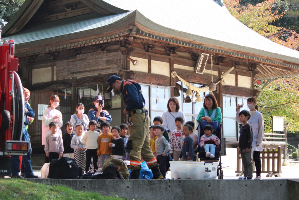 その後は、消防隊員の方が消防車や装備を見せてくださったり、サイレンの音を聞かせてくださったり、実際に消防服を着る様子を見せてくださったり、と盛り沢山で、子どもたちは目を輝かせて見ていました。
