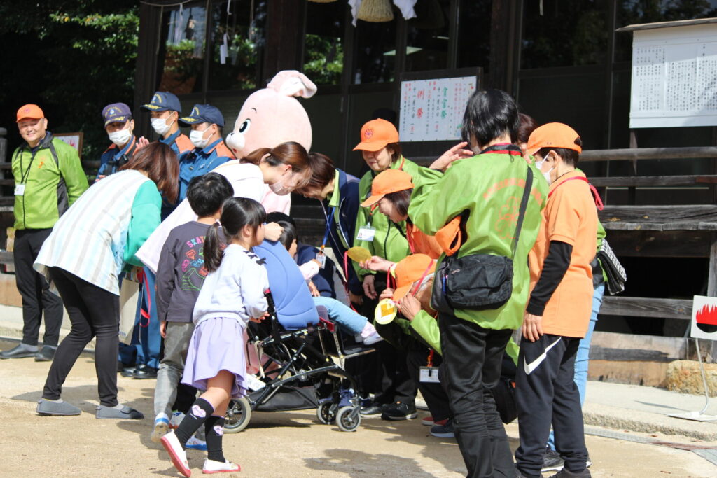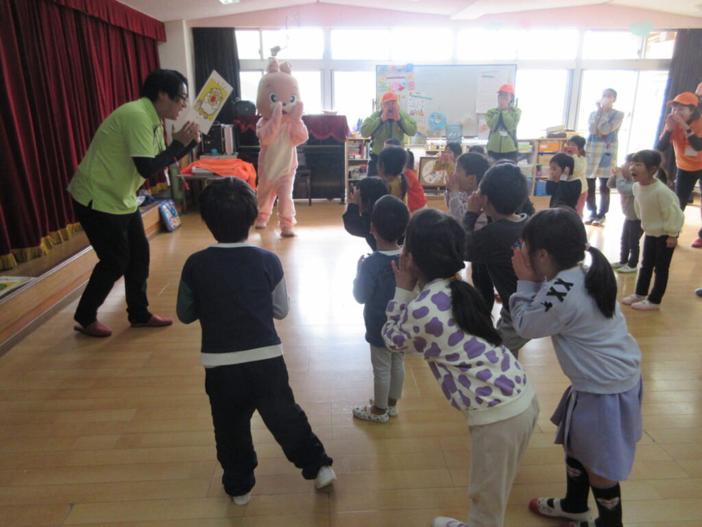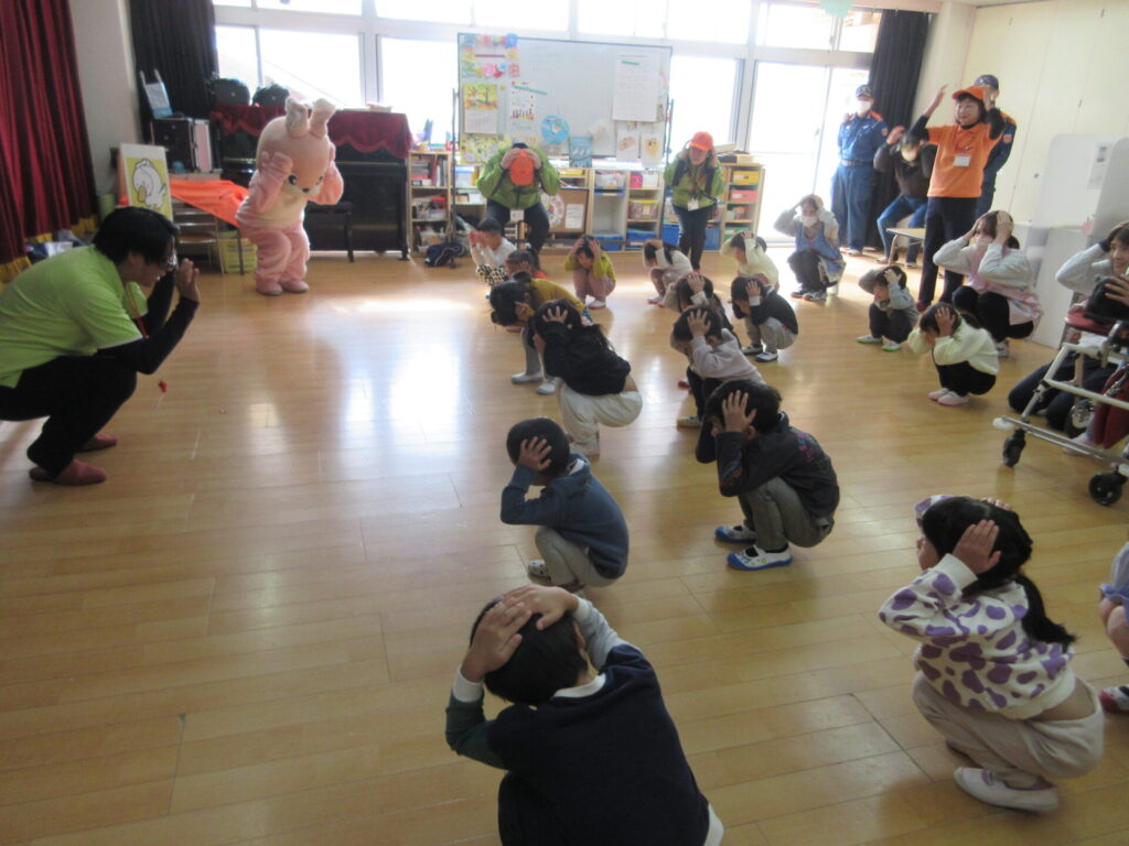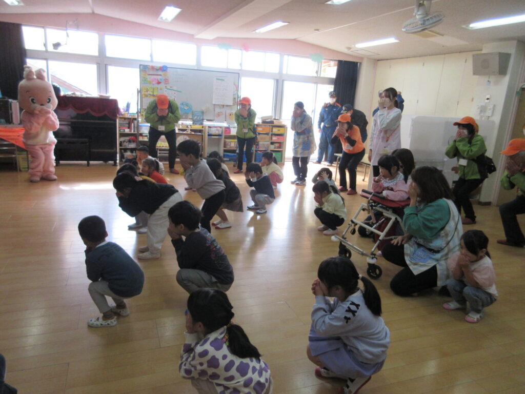 地震の時はダックポーズで頭を守り、火事の時はタヌキポーズで両手を口に当て、台風の時はウサギポーズで情報を聞き、誘拐されそうになったらヒツジポーズで大きな声で叫ぶというように、子どもたちも声を出し、体を動かしながら楽しくポーズを覚えました。