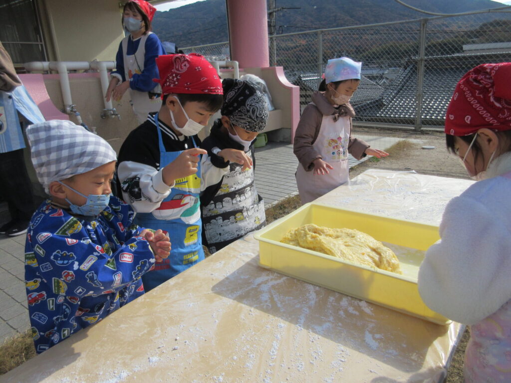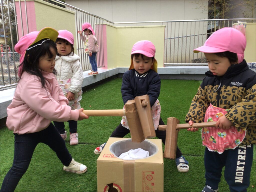 小さい杵でも子どもたちにとっては重たいのですが、年長組は一人でも上手につきましたよ。