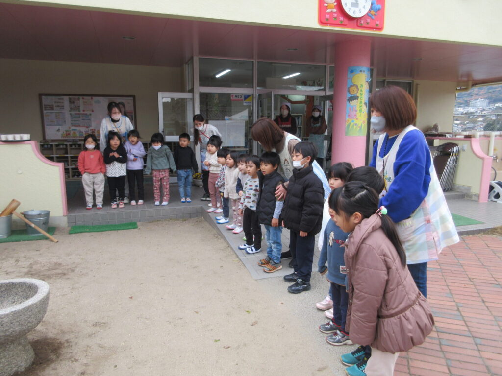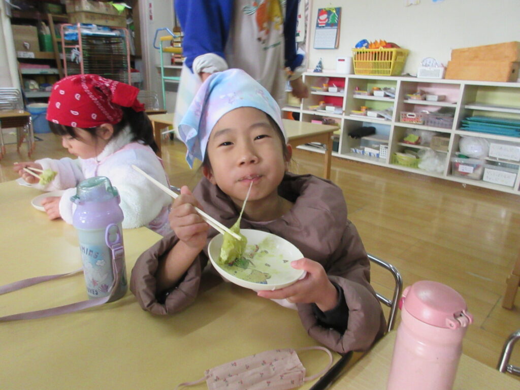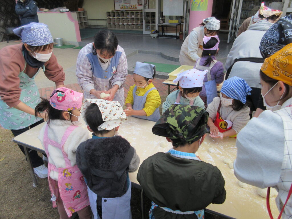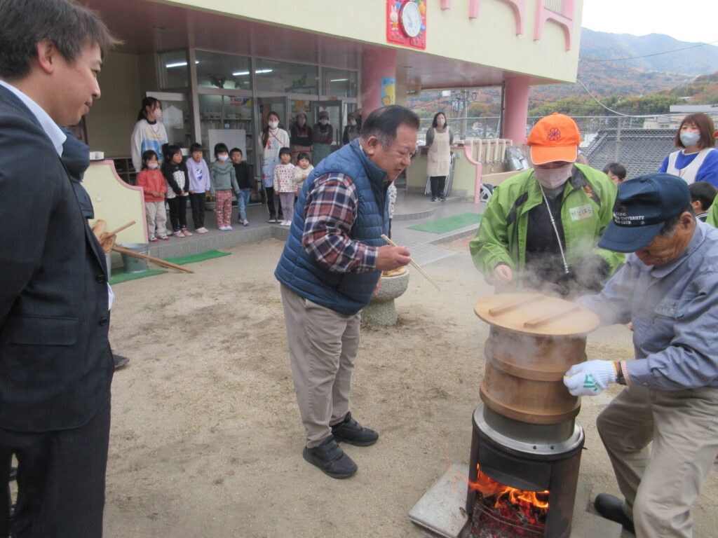 地域の方を招いて毎年恒例のもちつき会を行いました。この日は特別寒い日で、もち米をせいろで蒸すと湯気がもくもくと上がりました。