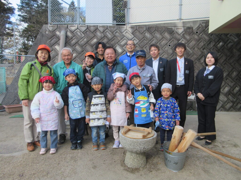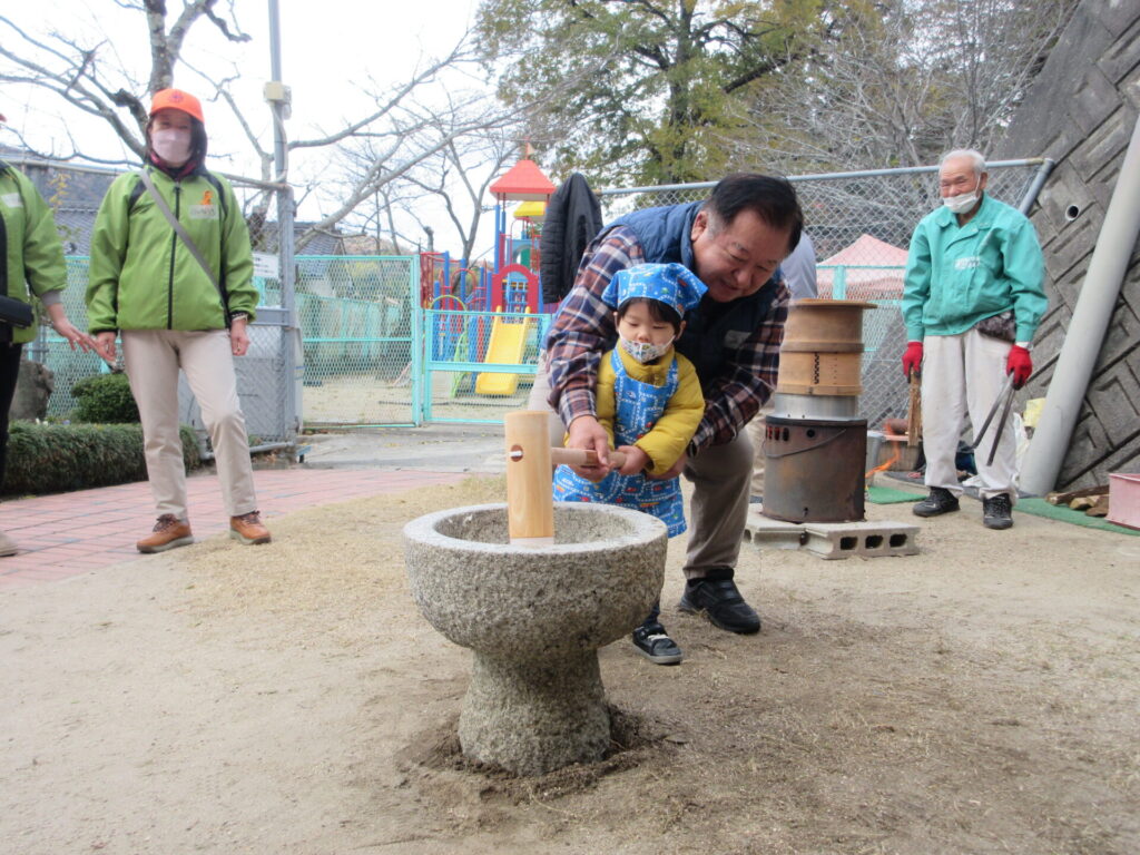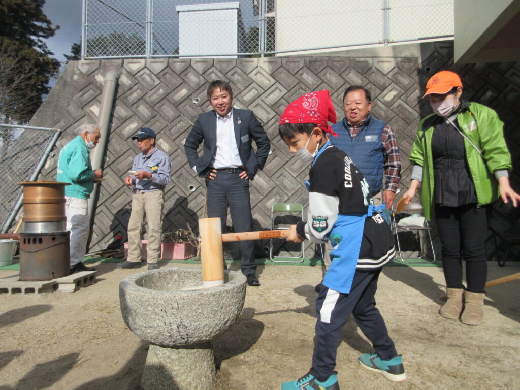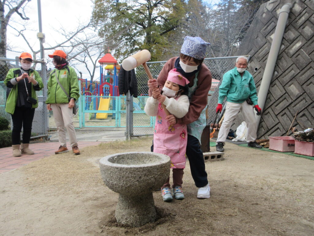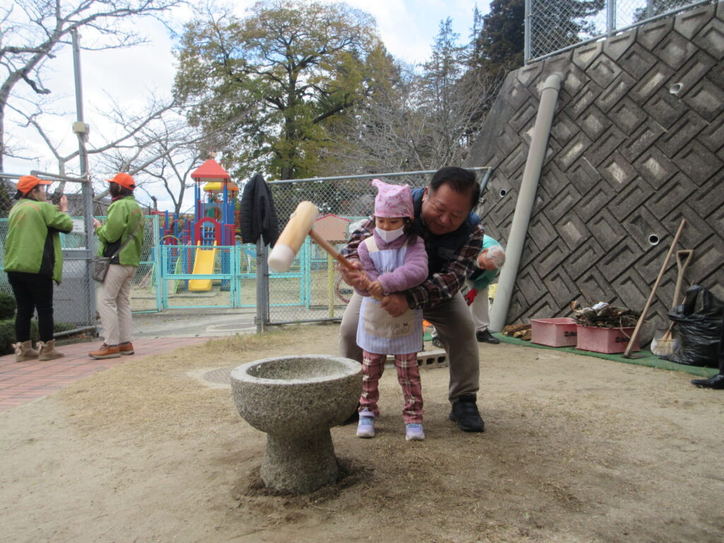 「よいしょー!よいしょー!!」の掛け声に合わせて、地域の方と一緒にお餅をつきます。