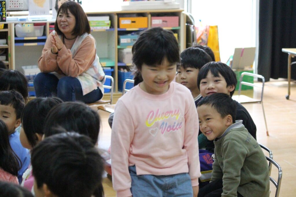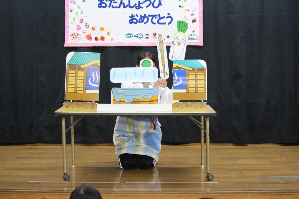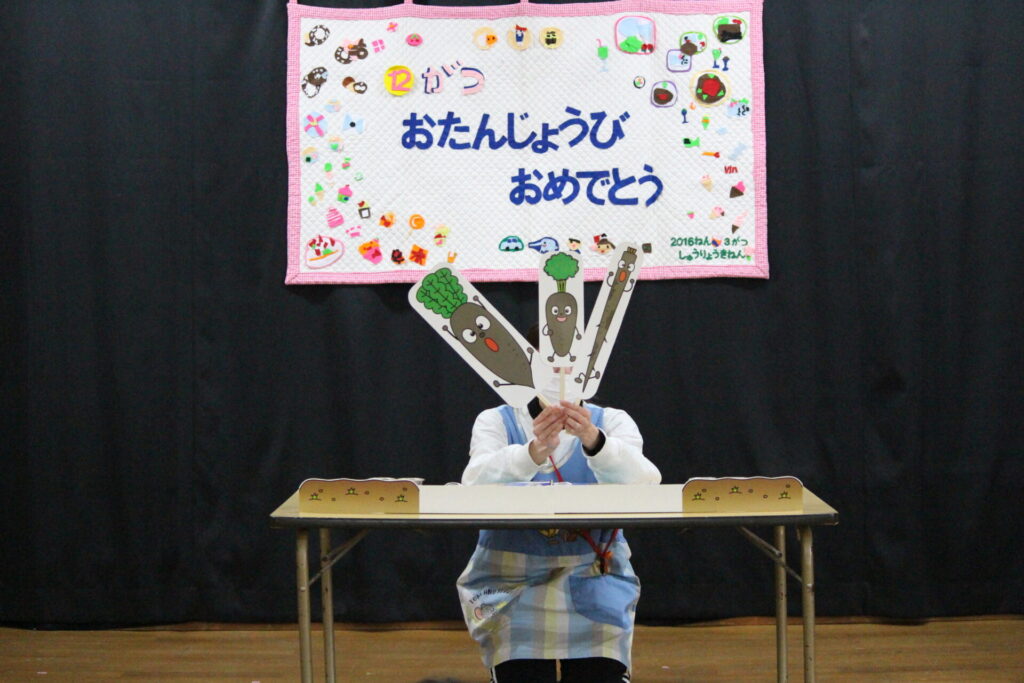 先生からのお楽しみは『にんじん だいこん ごぼう』のお話のペープサート劇でした。