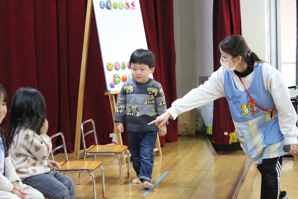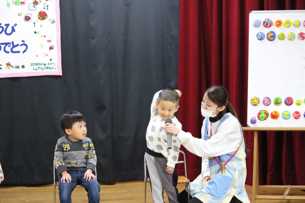 大きい組のお友だちの名前が呼ばれると、元気に「はい!」と返事をしてステージへ上がっていきます。それを見ていた小さい組のお友だちも、名前を呼ばれるとかっこよく「ハイ!」とお返事をして1人でステージに上がっていきましたよ(o^―^o)